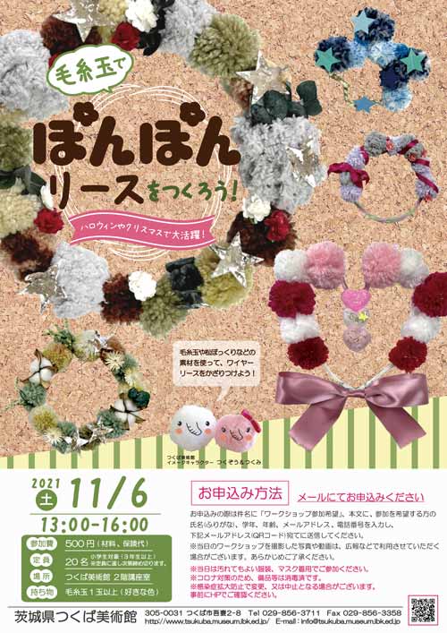 毛糸玉や松ぼっくりなどの素材を使って、ワイヤーリースをかざりつけよう!