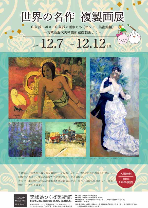 茨城県近代美術館が教育普及教材として所蔵している、西洋名画の複製画の中から、オルセー美術館所蔵作品17点と、その他2点を加えた19点を展示します。
