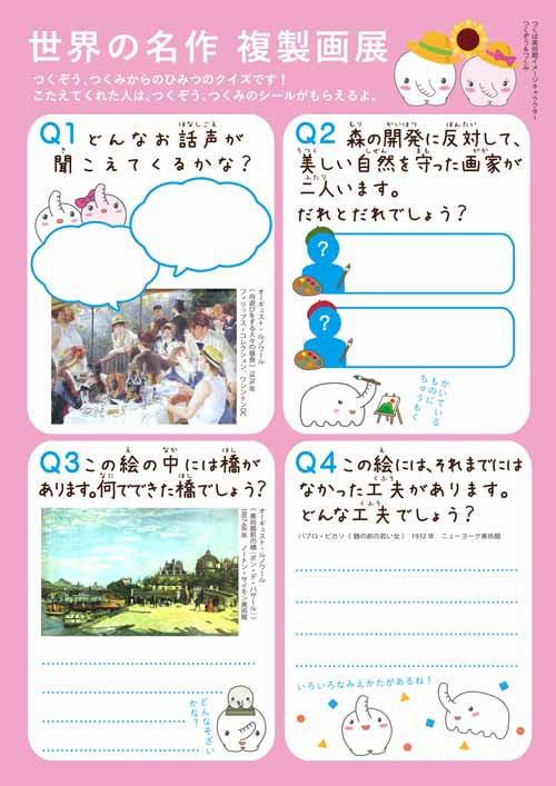 エコな素材を使ったクラフト工作と、おりがみ、ぬり絵などを楽しめます。美術鑑賞の合間に、大人も子どもも、ぜひ、ご参加ください。