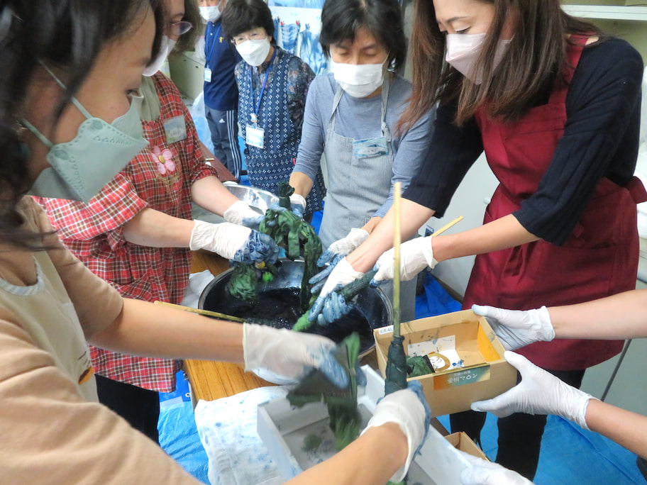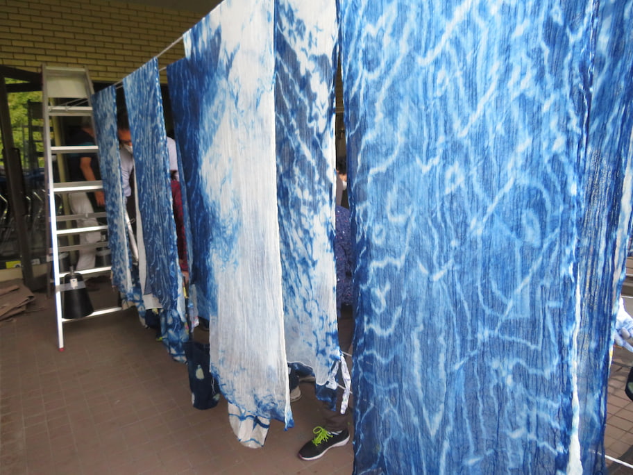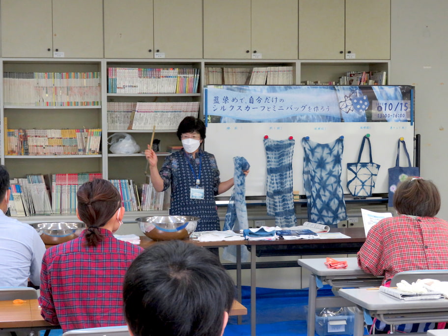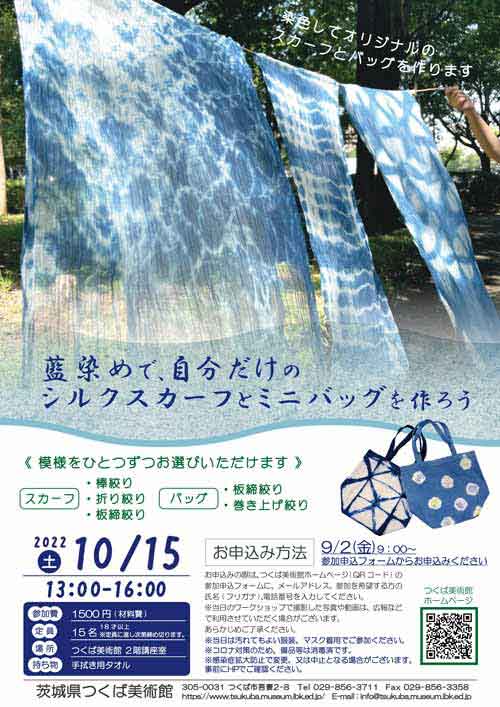 染色してオリジナルのスカーフとバッグを作ります。模様をひとつずつお選びいただけます。