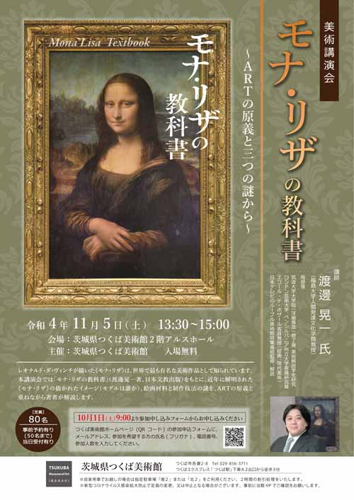 レオナルド・ダ・ヴィンチが描いた《モナ・リザ》は、世界で最も有名な美術作品として知られています。本講演会では「モナ・リザの教科書」(渡邊晃一著、日本文教出版)をもとに、近年に解明された《モナ・リザ》の描かれたイメージ(モデルは誰か)、絵画材料と制作技法の謎を、ARTの原義と重ねながら著者が解説します。