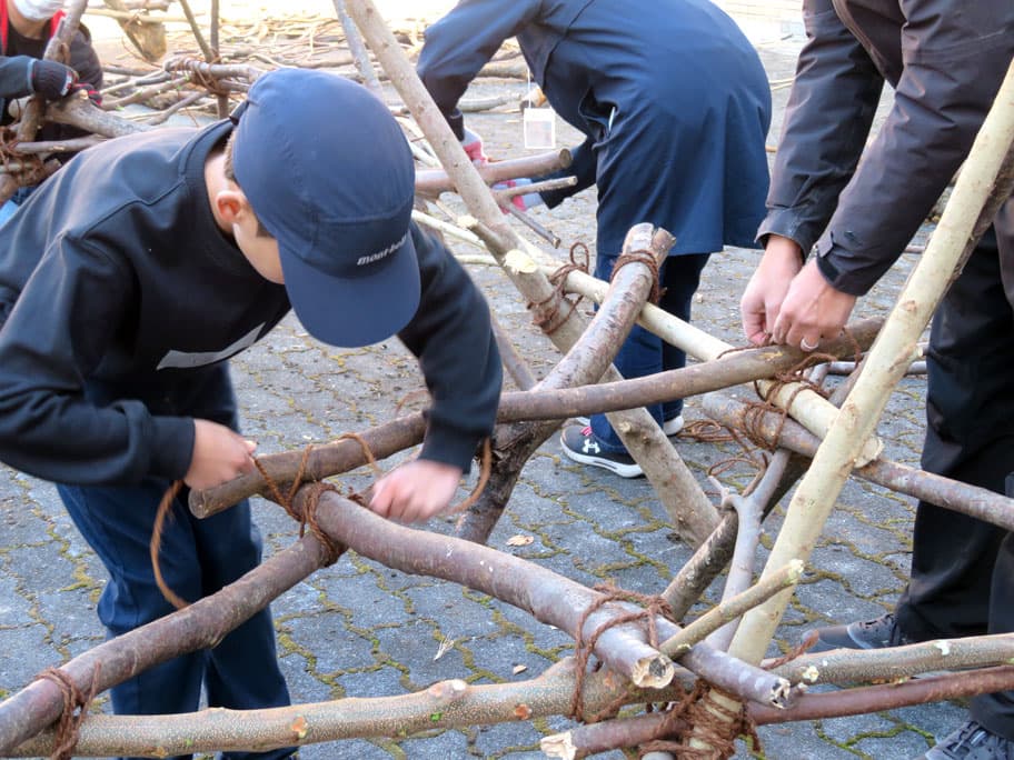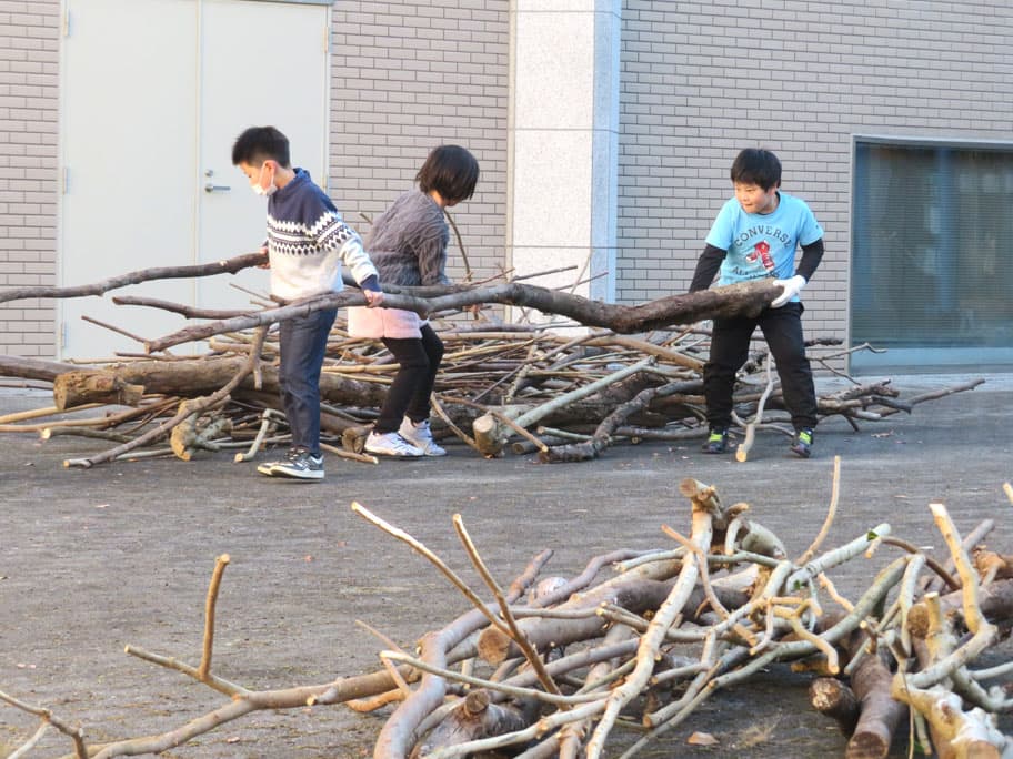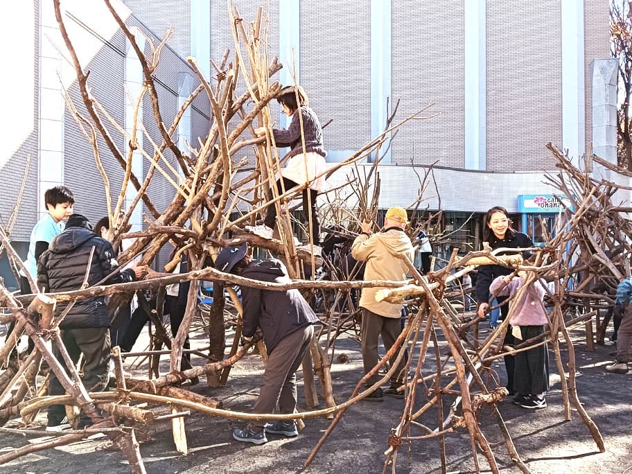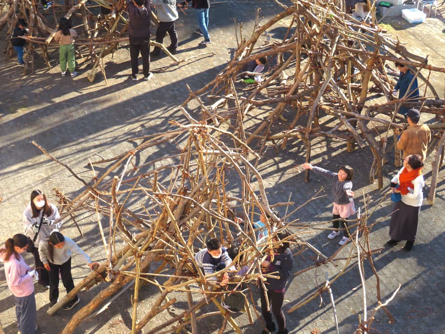 今回のテーマは「再生または生み出す力」。声をかけあいながら木を組み立てて自立させます。